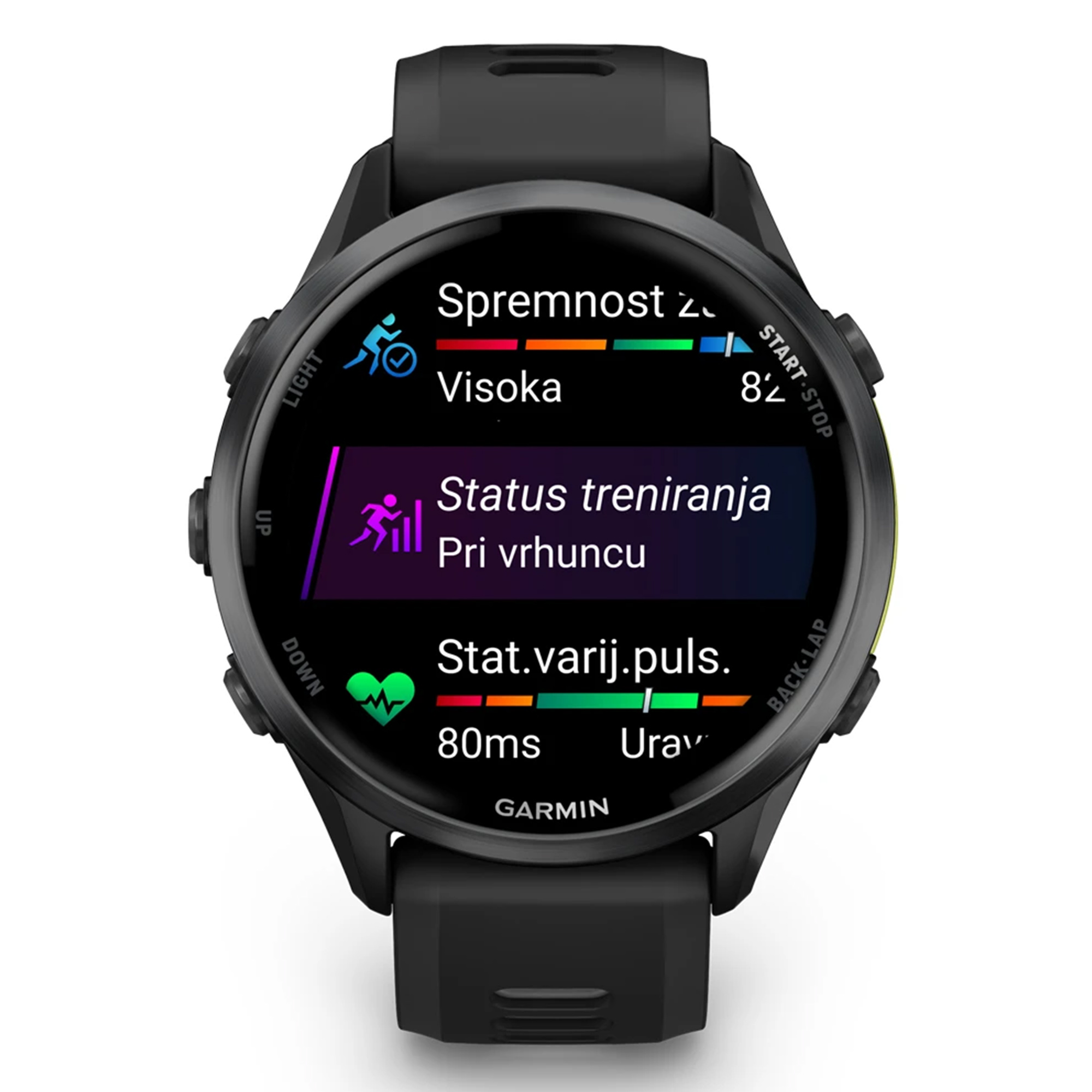 STATUS TRENIRANJA - Pomoću indikatora kao što su status varijabilnosti pulsa (HRV), vaša nedavna historija vježbanja i maksimalni VO2 steknite jednostavan uvid u učinkovitost treninga i saznajte trenirate li produktivno, prema vrhuncu ili pod opterećenjem.