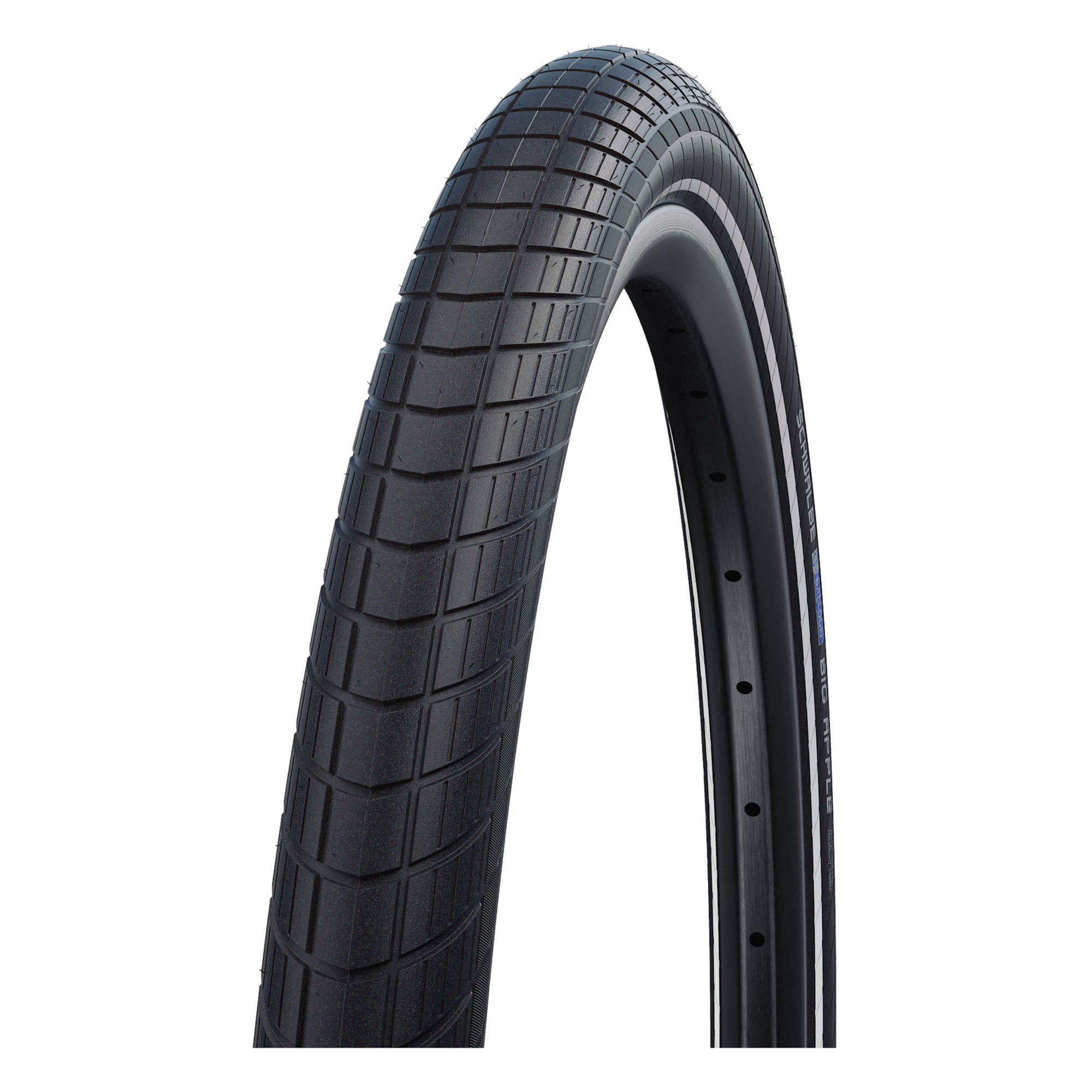 U svojoj trećoj generaciji, SCHWALBE Big Apple kombinuje vrhunske karakteristike udobnosti sa modernim dizajnom i pouzdanim performansama. Zahvaljujući širokim dimenzijama, idealan je izbor za klasični bicikl, kao i za e-bike. Vrlo izdržljiva univerzalna smjesa sa širokim rasponom zahtjeva za gume u Performance Line. Zračna suspenzija ugrađena direktno u gumu. Ova tehnologija omogućava izuzetno ugodnu vožnju bez potrebe za komplikovanim ovjesnim sistemima. Zračni jastuk u gumi djeluje kao prirodni amortizer – pri pritisku od oko 2 bara, bicikl se kotrlja lagano i pruža visok nivo udobnosti.