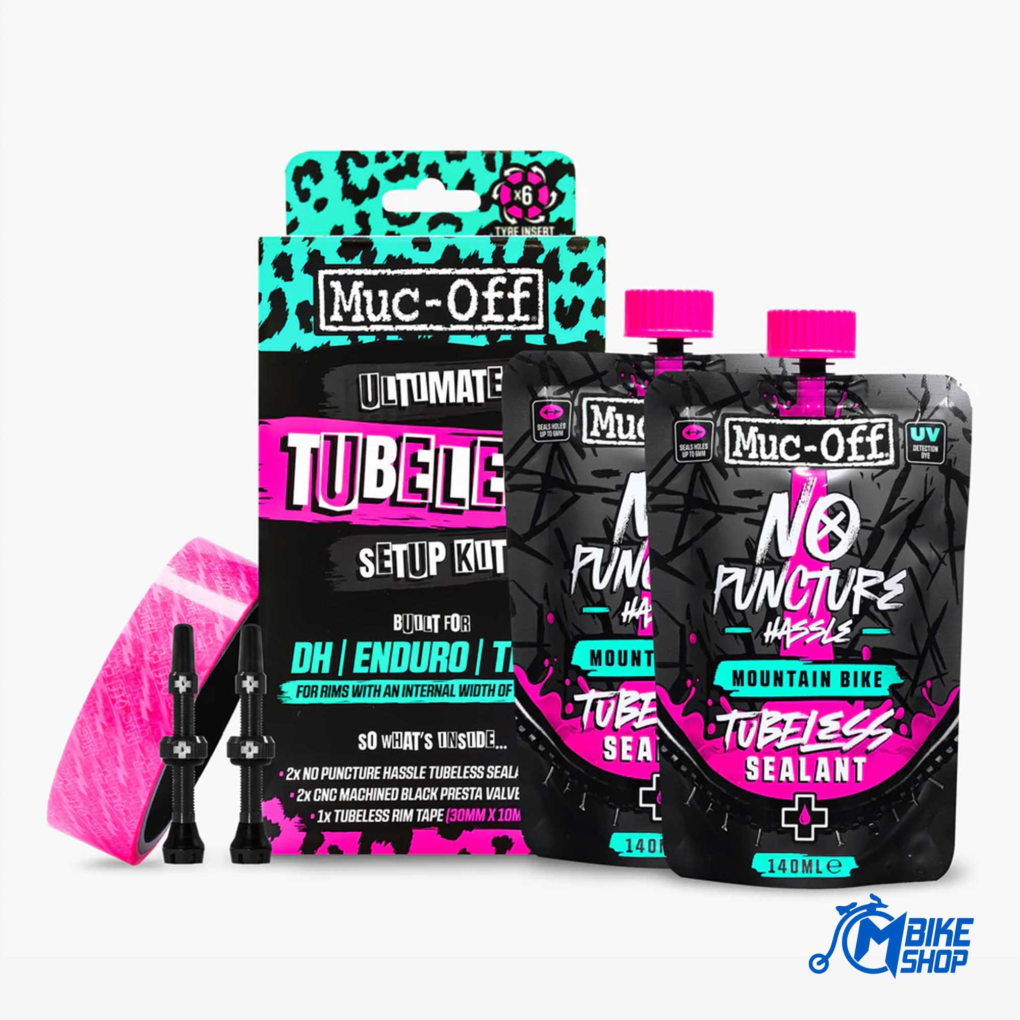 Muc-Off Ultimate Tubeless Kit sadrži sve što je potrebno da se set točkova spreman za tubeless postavi i bude spreman za vožnju. Svaki komplet sadrži Muc-Off traku za naplatke bez zračnica, zakrpe za brtvljenje, 2 CNC strojno obrađena crna ventila za zračnice i 2 vrećice brtvila za zračnice No Puncture Hassle.