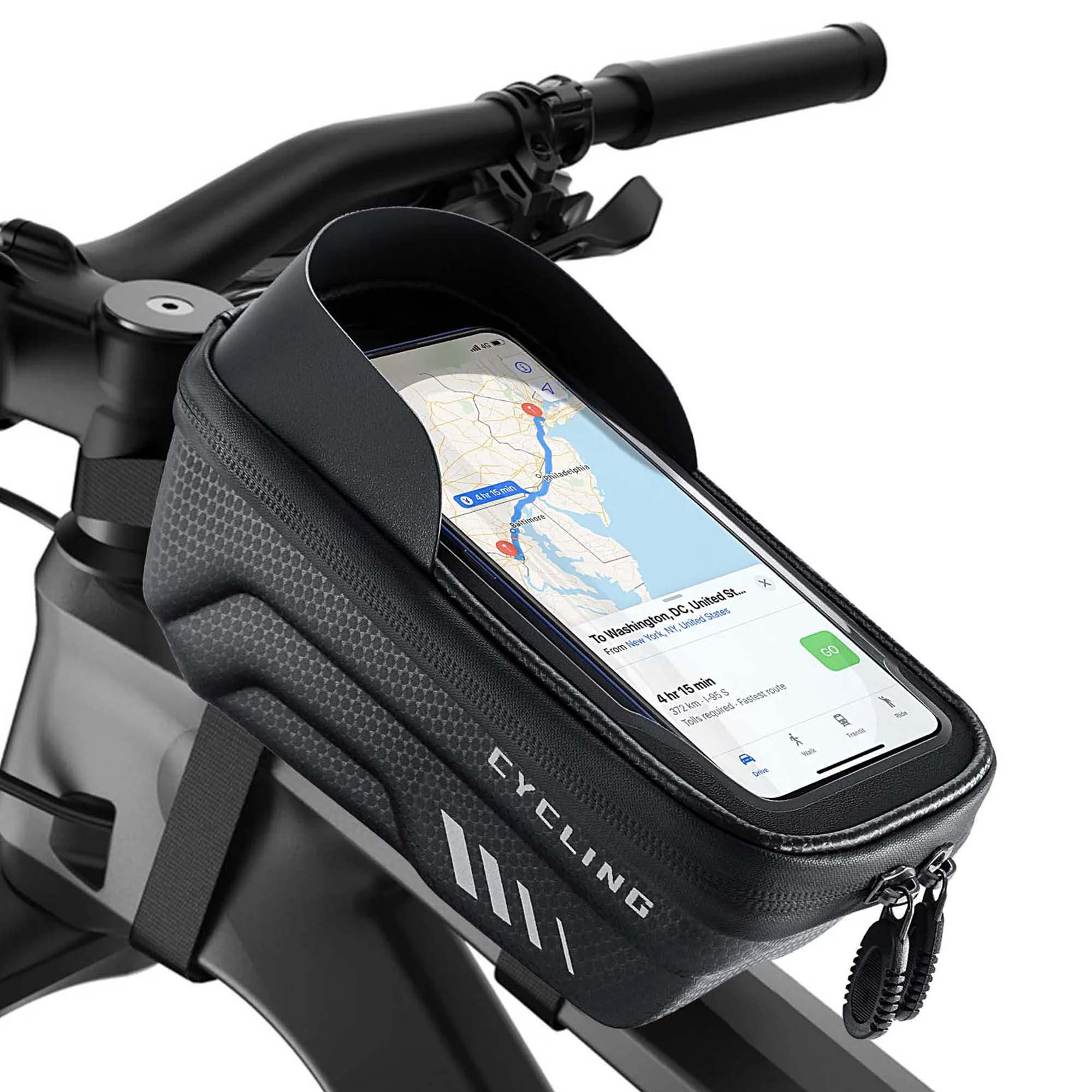 Udobnija vožnja biciklom: Zaštitni štit blokira sunčevu svjetlost i omogućava vam lak pregled zaslona. Džep za telefon ima debeli zaštitni sloj spužve koji štiti vaš telefon od udaraca.