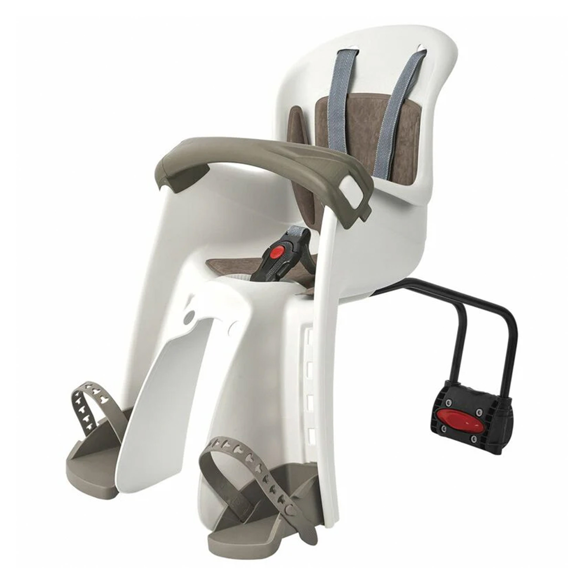 Udobna i sigurna, ergonomski oblikovana korpa za težinu djeteta 9 – 15 kg. Pozicija korpe-sjedenja ispred vozača. Montaža, nosača korpe, na srednju (sjedišnu) cijev rama bicikla (okruglu ili ovalnu) Ø 28 – 40mm. Sigurnosni pojas u 3 tačke vezivanja, srednji štitnik-držač za ruke i štitnici za noge podesivi po visini, obezbjeđuju sigurnu vožnju.